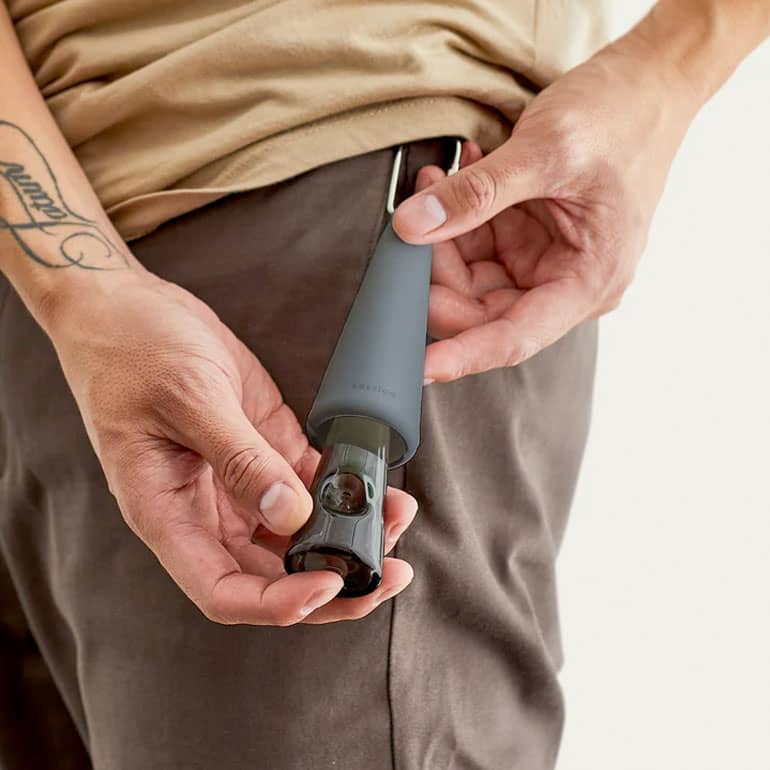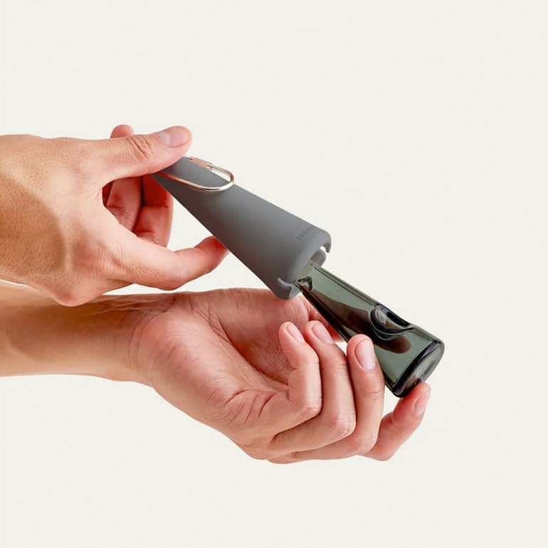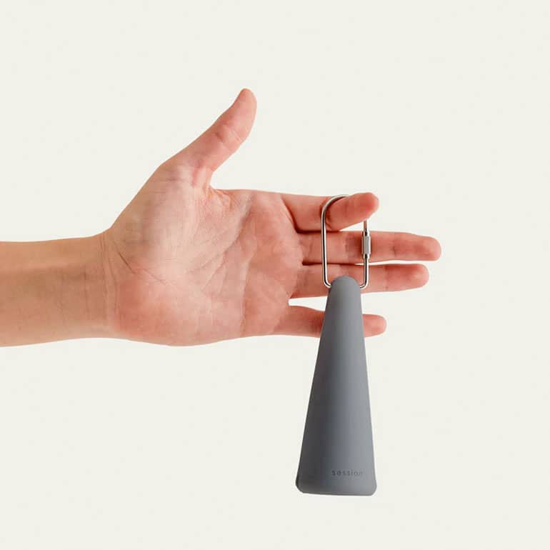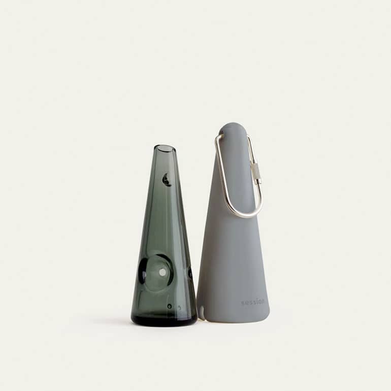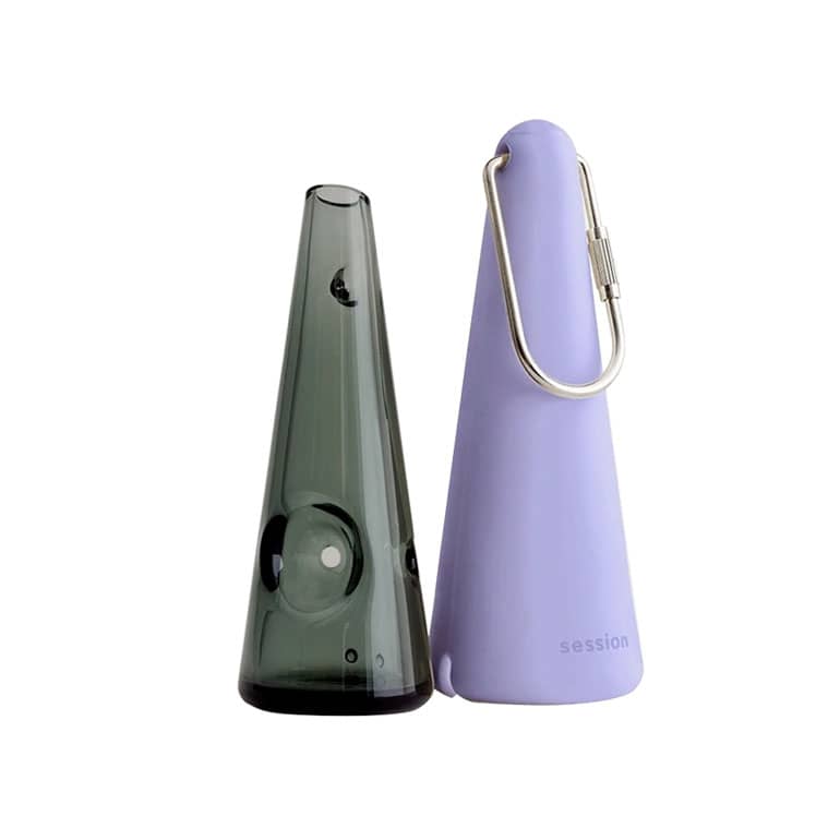 The Session Goods Pipe is a stylish and practical handheld pipe that has been thoughtfully designed for the modern smoker. Made of high-quality 2.5mm thick, black-tinted borosilicate glass, this pipe comes with a custom designed silicone sleeve that protects it from breakage and your bag from ash. The pipe features an ash-catching indent for clean hits as well as a flat base and small roll stops so it can sit upright or lay flat on its side while you pack a bowl. A steel keychain conveniently allows you to attach it to your bag or belt loop.