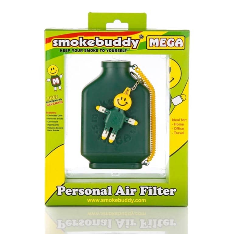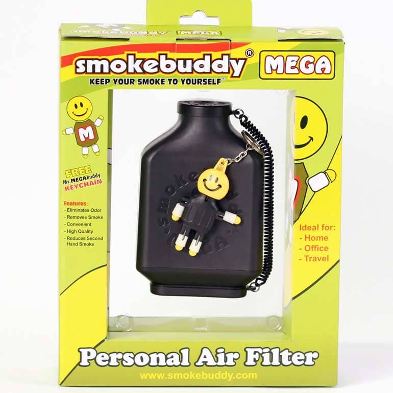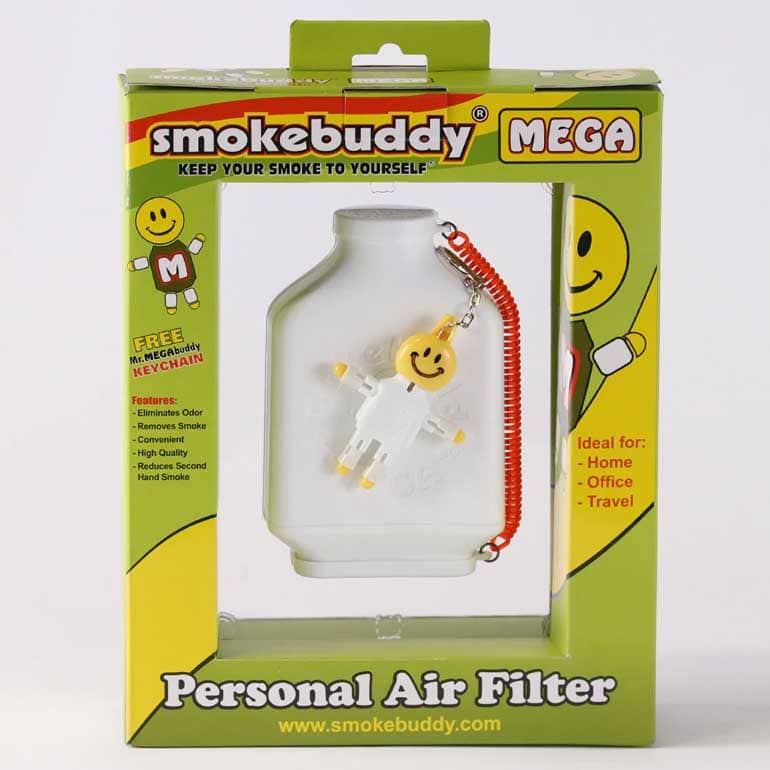 The Smokebuddy MEGA is the largest personal air filter in the Smokebuddy series. It's designed with a filter that's twice as large as the Original Smokebuddy, and its flat shape fits in your hand and looks great. Every Smokebuddy MEGA also includes a MEGA size Mr. MegaBuddy LED keychain that will light up when you squeeze him.